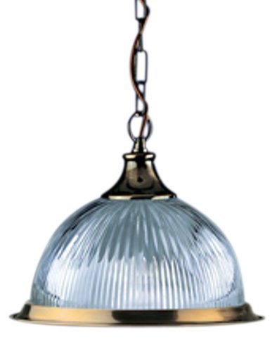 9369 Features: -Pendant. -American Diner Range. -Finish: Antique Brass. -With clear ribbed translucent glass diffuser and matching metal trim. Specifications: -Accommodates: 1 x 100W E27 / LE 18W bulb. -Overall dimensions: 20 cm H x 30 cm W.