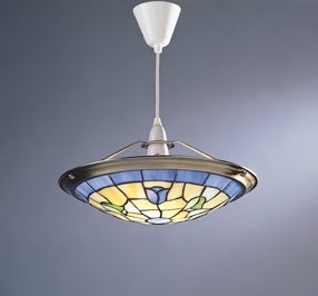 Handmade stained glass tiffany pendant shade in a blue finish with antique brass trim. Height - 13.5cm Diameter - 35cmBulb type - GLS bulbBulb wattage - 1 x 100w (not included)
